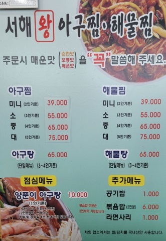 - 가격 : 아귀찜 미니(2인) 39,000원 / 小(3인) 59,000원 / 中(4인) 69,000원 / 大(5인) 79,000원, 볶음밥(2인) 6,000원
