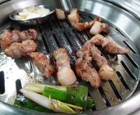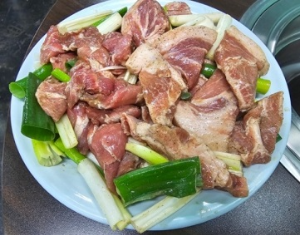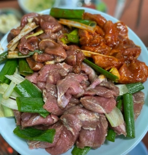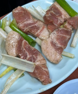 돼지뽈살을 처음 먹어 보는 사람들은 느끼하지 않고 담백하면서 질기지 않고 쫄깃하다고 말합니다. 기본맛으로 주문해도 생고기가 아니라 약간 양념을 해서 파와 함께 나오는데 고기와 파를 함께 구워먹으면 별미입니다.