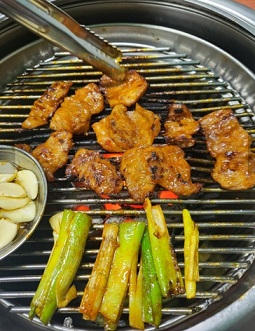 신사돼지뽈집의 숯불은 불이 쎈편입니다. 고기도 빨리 익고, 사장님이 빠르게 불판을 가려주시고 부족한 반찬을 리필해 주십니다. 역시 26년의 전통은 그냥 되는게 아닌 것 같습니다. 고기와 함께 나오는 마늘에 기름칠이 되어 있어서 타지 않고 센스있다고 생각합니다.