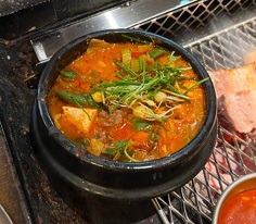 첫 입은 산청뽕소금만 살짝 찍어서 본연의 고소한 맛을 느껴보세요. 고기에 구운 쪽파를 곁들여 우렁조림에 찍어드시면 이 집 만의 감칠맛을 경험하실 수 있습니다.